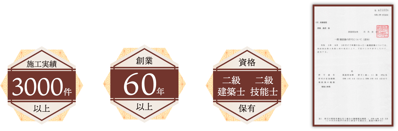 上越市の皆様に愛され続け、高橋建築はおかげさまで創業60年を超え、施工実績は3000件以上。